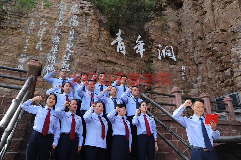 學員們踏上350米的廊橋——“紅飄帶”,來到青年洞洞口。1973年,全國人大常委會副委員長郭沫若親自題寫了洞名。洞口刻有李先念、江澤民題詞。學員們集體在洞口合影留念,并重溫入黨誓詞。